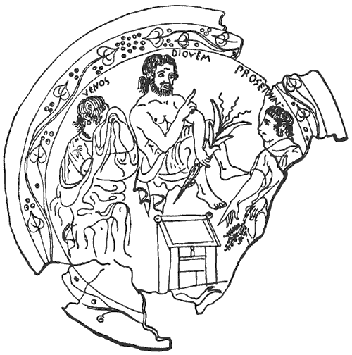 Рис. 29. Бронзовое зеркало. Венера и Прозерпина спорят перед Юпитером за обладание малышом Адонисом, который лежит в сундуке. Имена богов написаны архаической латынью и различным шрифтом: Venos, Diovem, Prosepnai (Венера жалуется Юпитеру на Прозерпину). Зеркало из Пренесте, найденное в Орбетелло. IIIPв. до н.Pэ. Лувр, Париж.